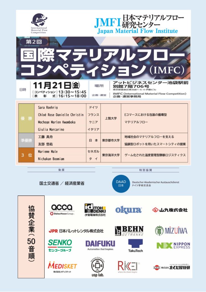 この度は、「第2回 国際マテリアルフローコンペティション(IMFC:International Material Flow Competition)」を盛況のうちに開催できましたことを、スポンサー企業様ならびにご後援をいただきました国土交通省様、経済産業省様、ドイツ学術交流会様に対し心から御礼申し上げます。また、本競技会に積極的にご参加頂きました大学生、大学院生、ならびに彼らの指導教官の方々にも厚く御礼申し上げます。